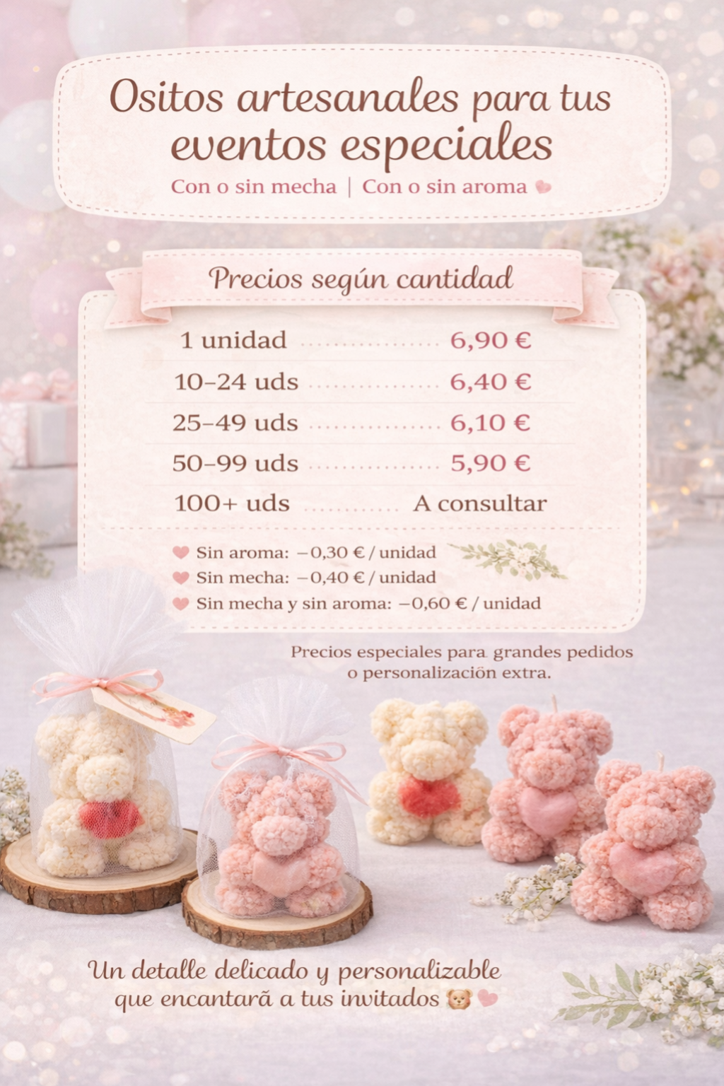 Nuestra pasión es crear piezas únicas que reflejen la esencia de tu celebración. Desde la elección del aroma hasta el diseño de la etiqueta, cada proyecto es una obra de arte pensada exclusivamente para ti.